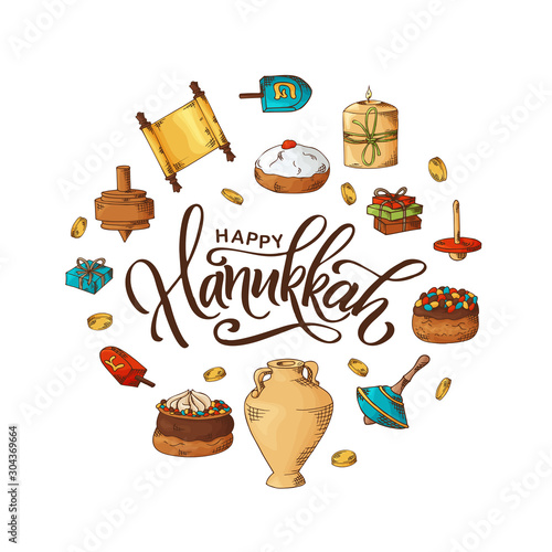 Sauna and spa advertising poster vector illustration with different tools and equipment. Round composition with wooden tub with hot water, ladle or spoon, folded stack of towels, oak brooms and brush