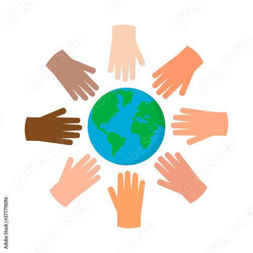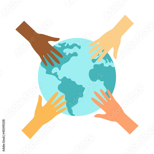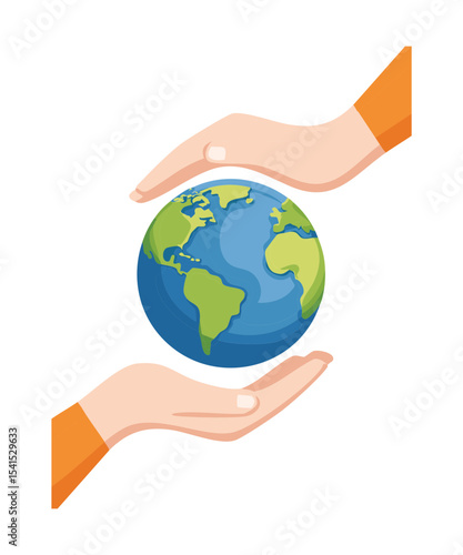 Save earth vector illustration. Human hand reaching globe over world map design. Environment protection and ecosystem cultivation concept. Global planet ecology day