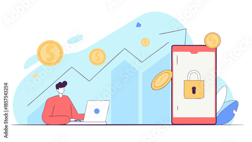 Saving money in a bank, money safe box, consious eating. Healthy food, fruits. Concept illustration. Vector web site design template. Landing page website illustration