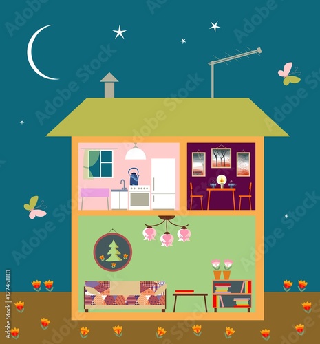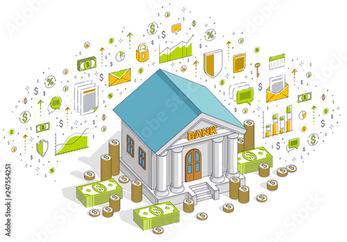 Savings with smart house concept vector flat illustration. House with automated home security, lighting and other systems controlled remotely, dollar coins falling out of building into human hand.
