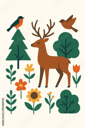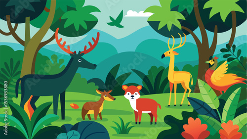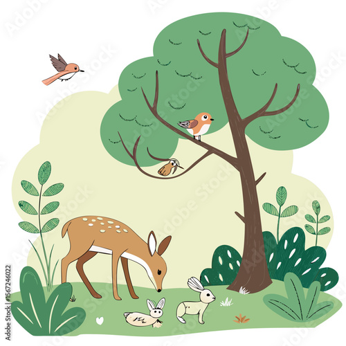 Scared wild animals running and birds flying away from wildfire in forest scene. Nature conservation, environmental protection, defense of national parks vector illustration