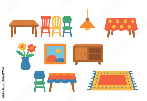 Scattered clothes, female stuff in chest of drawers, on chair, on table, on coffee table, in laundry basket, flat vector isolated illustration. Mess, disorder.