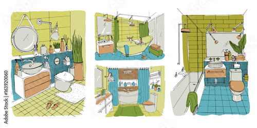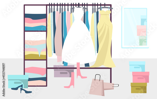 Scattered clothes, female stuff on desk, on washing machine, on table, flat vector isolated illustration. Mess, disorder.