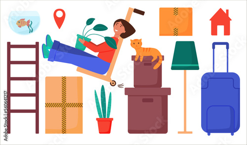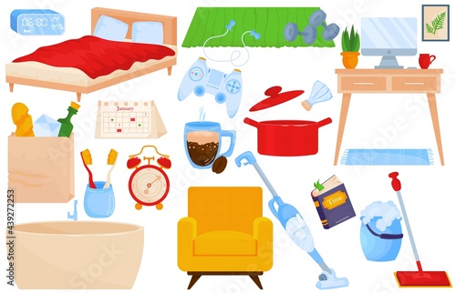 Scattered clothes, female stuff on desk, on washing machine, on table, flat vector isolated illustration. Mess, disorder.