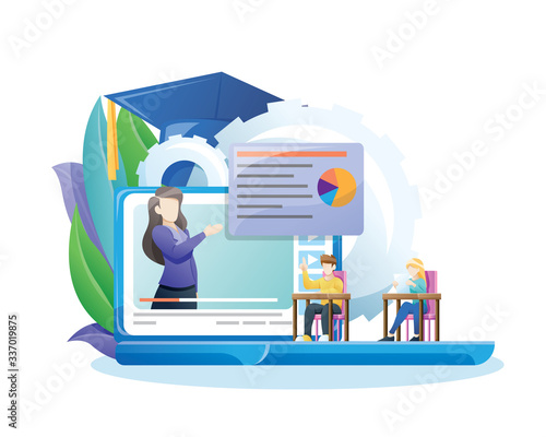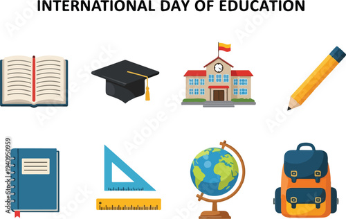 School and education vector illustration set isolated on white background. School building, bus, pupils, backpack, graduation hat, stationery and other school supplies.