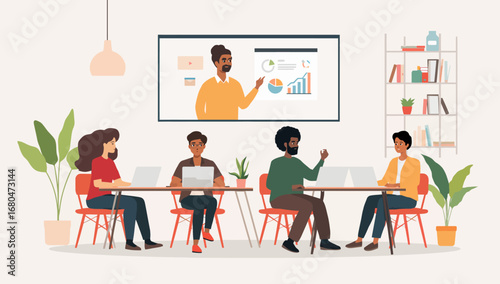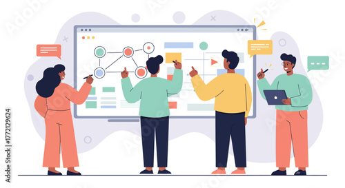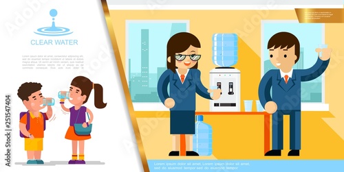 School canteen scene set, flat vector isolated illustration. School children having lunch sitting at table, staying in line, carrying tray with meal, buying snacks from food vending machine.