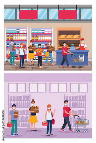 School canteen set, vector illustration. Pupils, students boys and girls cartoon characters having lunch in dining room, buying snack food and drinks from vending machine.