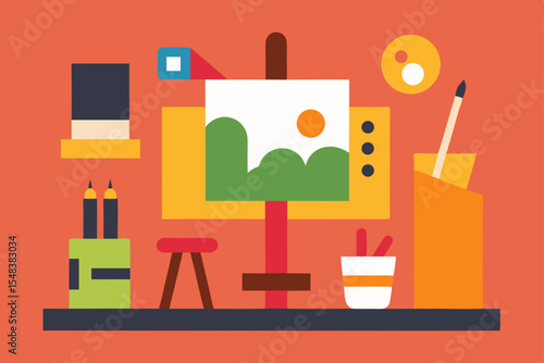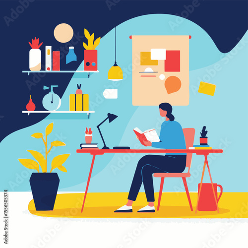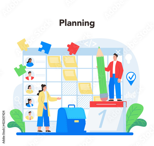 School education. Teacher female with pointer standing on pile of books, flat vector illustration. Back to school, college or university scene with tiny characters and giant stationery.