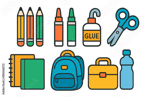 School set vector. Education supplies icon flat illustration. Stationery equipment and study accessories as book, schoolbag, pen and pencil, ruler, alarm clock, magnifying glass and paintbrush