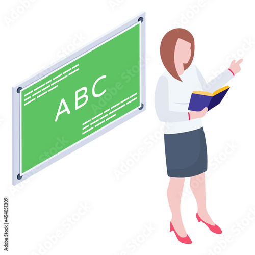 Vector illustration of teacher female with pointer. School people concept flat style design element, icon isolated on white background.