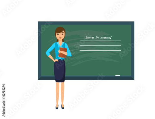 Vector illustration of teacher female with pointer standing next to chalkboard. School concept design element in flat style.