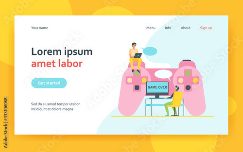 Science and technology poster. Scientists, microscope, research, physics. Atom structure. Vector web site design template. Landing page website illustration