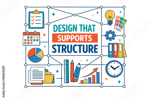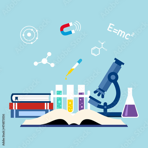 Vector flat style design poster with chemistry, physics, biology science concept design elements, icons. Laboratory glassware and science equipment.