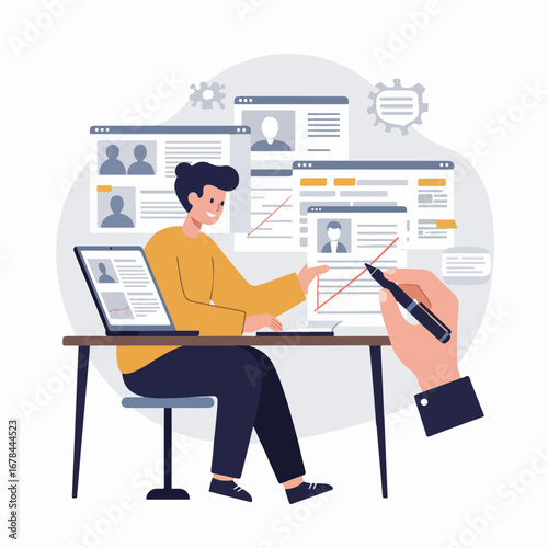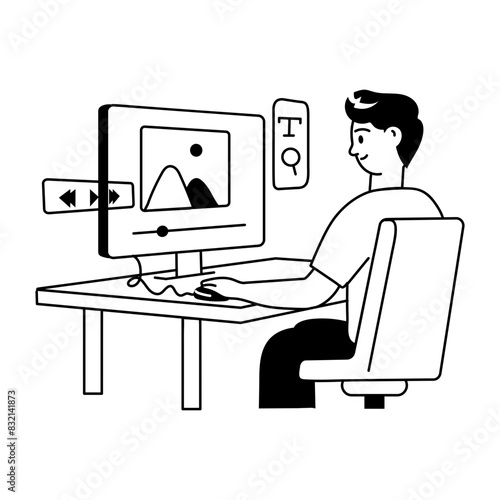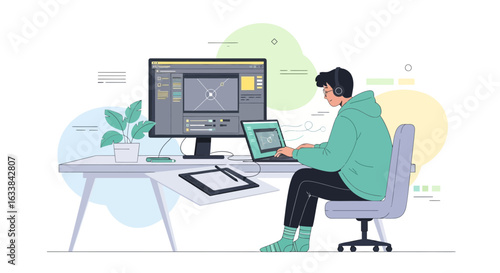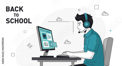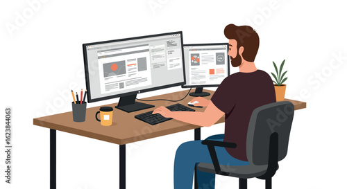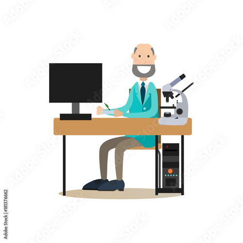 Vector illustration of scientist male sitting at table with computer and microscope on it. Science people concept flat style design element, icon isolated on white background.