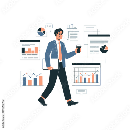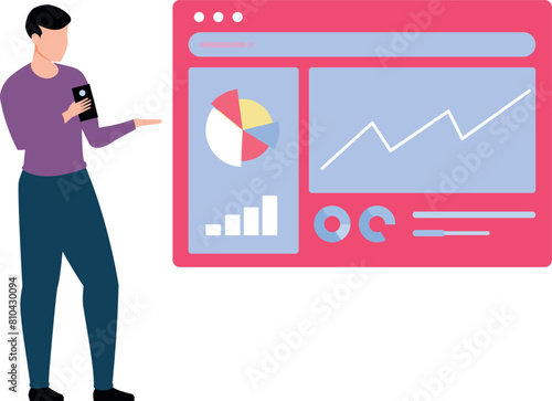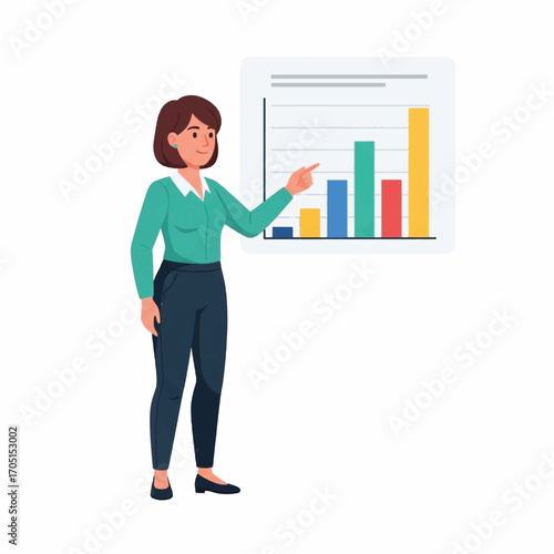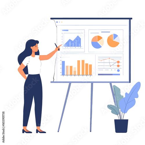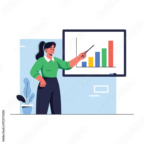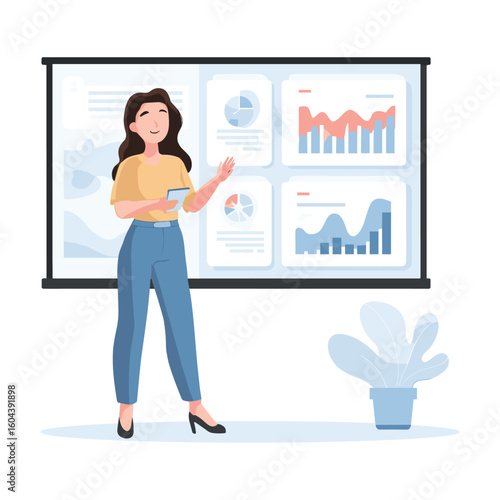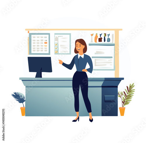 Woman standing next to laboratory cabinet with lab tubes, flasks, folders on shelves, vector flat illustration isolated on white background. Science experiment, education, scientific research.
