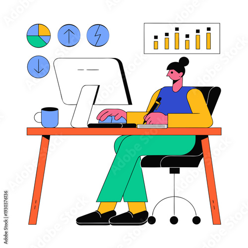 Woman scientist or lab attendant working in science laboratory using microscope and lab flask, vector flat isolated illustration. Scientific research, experiment concept for web banner, website page.