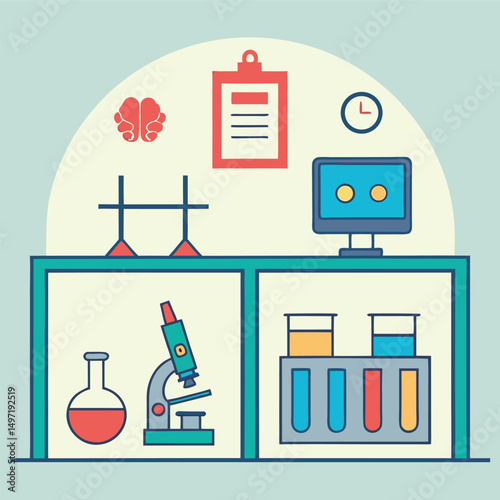 Science vector 3d icon. Chemistry laboratory research set. Dna molecule, atom, microscope and medical test equipment isometric symbol. Biology, biotechnology and chemical analysis concept