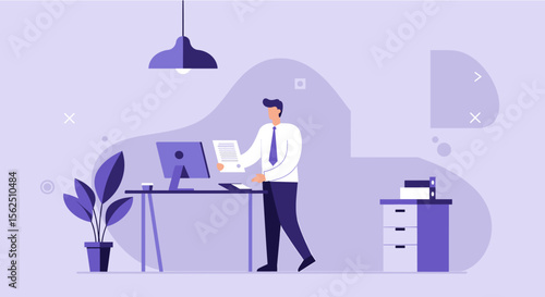 Vector illustration of biologist or chemist male in protective mask and glasses carrying out experiment. Laboratory equipment and interior. Scientific experiment flat style design element.