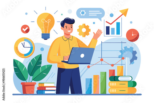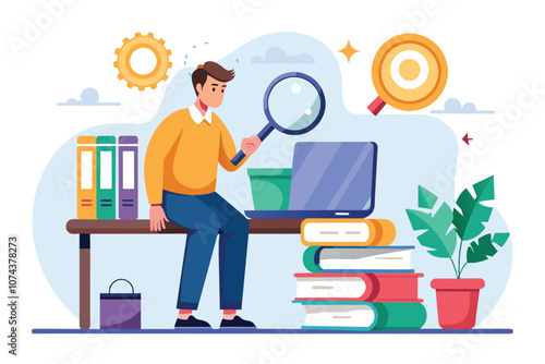 Science research laboratory scene. Scientist female character conducting chemistry experiment, flat vector illustration. Woman in lab coat using laboratory flasks, beakers, burner. Science, education.