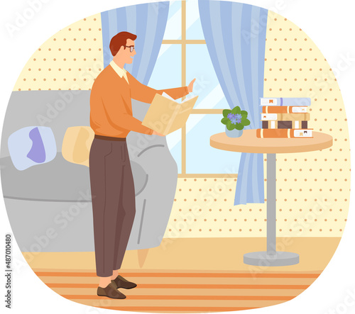 Science research laboratory scene. Scientist male carrying laboratory rack with tubes, flat vector illustration. Lab interior with furniture and glassware. Scientific research, experiment, education.
