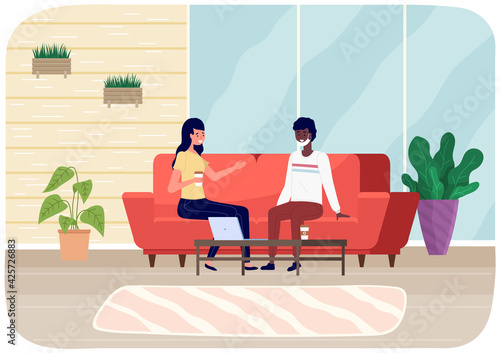 Scientists conducting scientific experiments in chemistry lab, flat vector illustration. Students making observations, tests using microscope, flasks, tubes, lab burner. Science laboratory research.