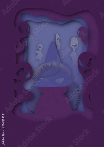 Sea fishing paper cut vector. Craft poster with fish and hook underwater layered illustration. Undersea wildlife, tourism and fisher sport recreation concept