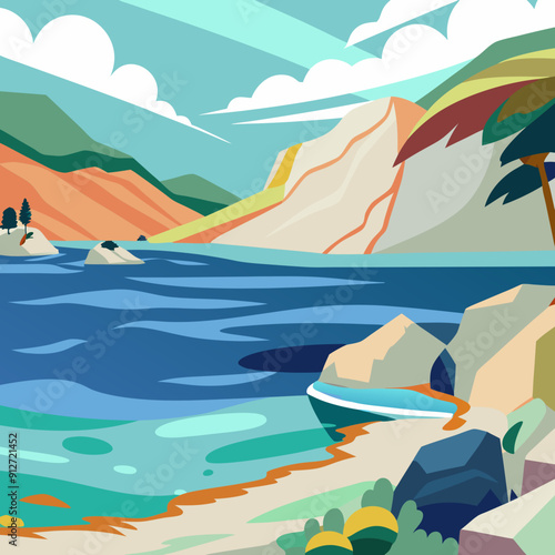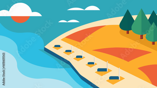 Sea voyage on sailboat vector illustration in papercut style. Creative water waves and floating yacht among tropical islands with fir tree and mountains hills background