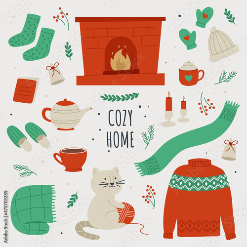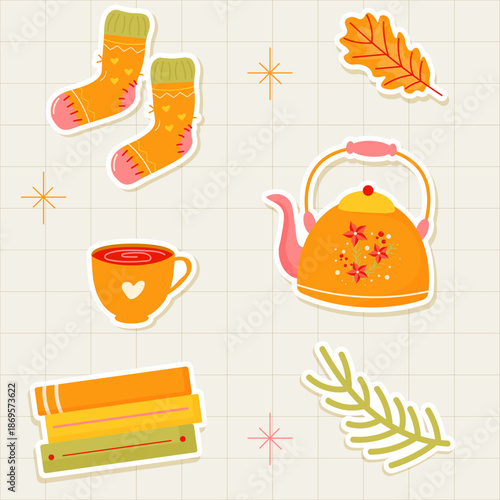 Seamless pattern with coffee and tea objects. Vector illustration background. French press coffee, tea pot, cups, cake and croissant.