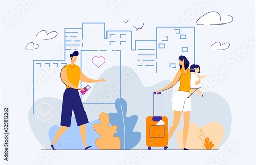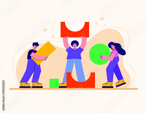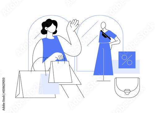 Sewing workshop, atelier, custom clothing, vector flat illustration. Big mannequin, thread and tiny characters working in tailoring shop using seamstress tools such as pin, thimble, measuring tape.