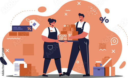 Seamstress dressmaker tiny male female characters sewing apparel, vector flat illustration. Big sewing machine, scissors, thread, cushion with pins, thimble. Tailoring workshop, atelier fashion.