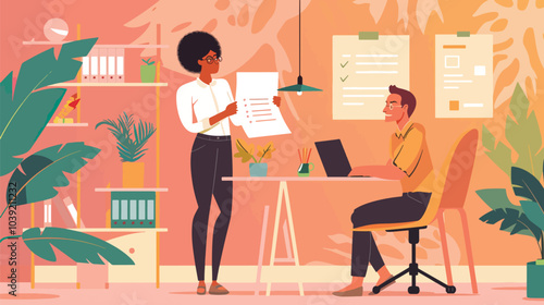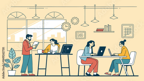 Seamstress team at fashion clothing factory workplace scene. Women working on sewing machines and taking measurements with tape vector illustration
