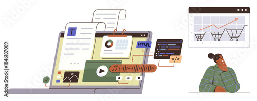 Entertainment cinema and travel ticket kiosks, supermarket self checkout, fast food restaurant self ordering kiosk, vector flat illustration isolated on white background. Self service technologies.
