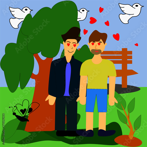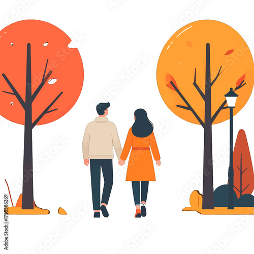 Senior couple walk in autumn park with dog. Old people active lifestyle concept vector poster. Romantic date of couple of senior people.