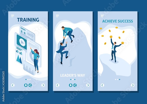 Elderly man practicing outdoor golf sport game with trainer. Mobile app screens. Vector banner template for website and mobile development. Web site and UI design illustration.