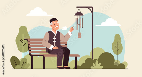 Vector illustration of elderly man with grey hair and beard sitting on bench. Senior man relaxing in park flat style design element.