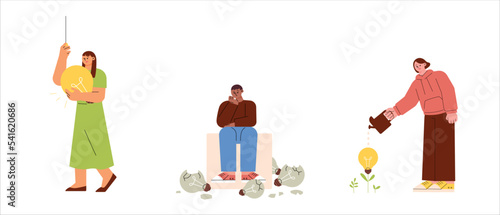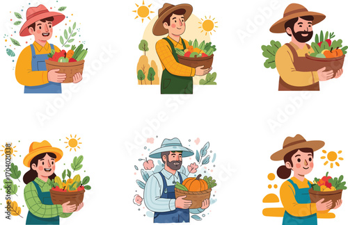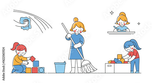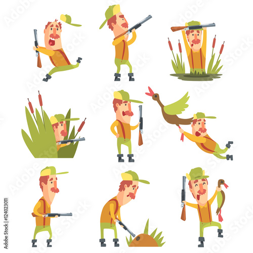 Set of happy family character parent and children camper during outdoor recreation activity on summer holidays. Preparation for picnic, making bonfire, fishing for dinner, taking memory photo