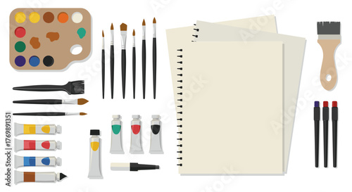 Set of tools for hand lettering and calligraphy vector. Calligraphic essentials as brush pen, notebook, nibs and nib holder, pencil, ink, marker, eraser. Art supplies illustration
