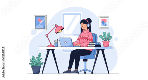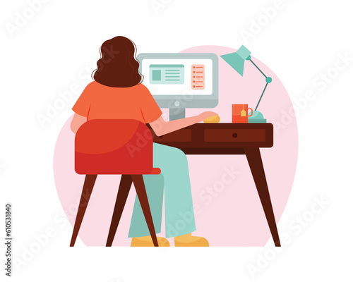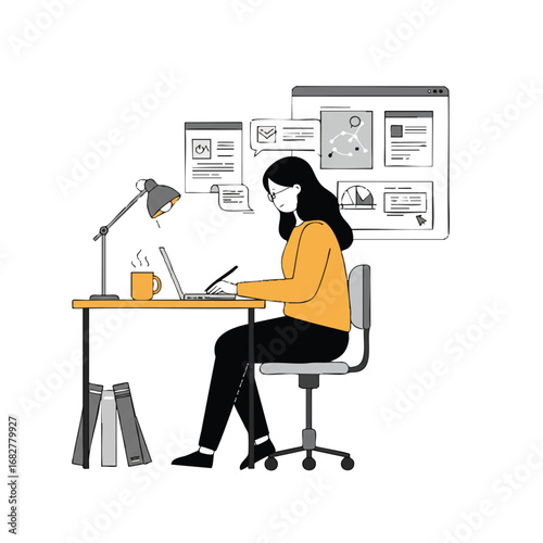 Seamstress sewing on electric sewing machine, vector flat illustration isolated on white background. Tailoring shop, atelier, garment factory, fashion sewing studio, custom clothing.