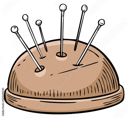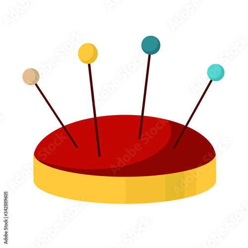 Sewing needles and pins in soft cushion vector icon isolated on white background