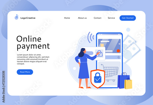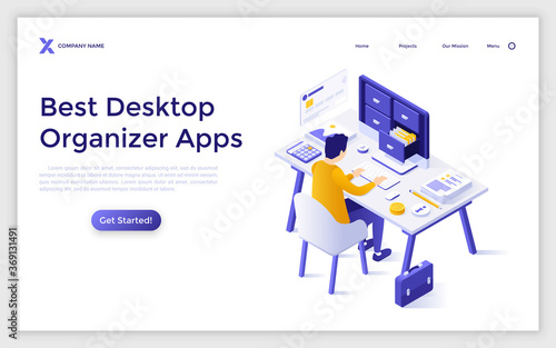 Sewing workshop vector website template, web page and landing page design for website and mobile site development. Huge sewing machine and micro male and female characters with thread, pin etc.
