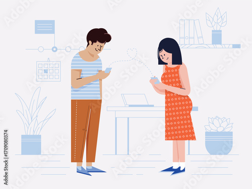 Shop assistant helping man customer to choose fashion eyesight glasses at optometry store vector illustration. Male visitor looking in mirror trying on trendy vision accessory