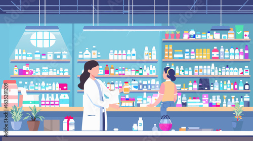 Shoppers in supermarket, grocery store, food shop, market, flat vector illustration. People buying fruits, vegetables, fresh bread, diary products, paying for purchases. Buyers shopping for food.