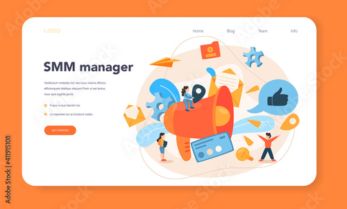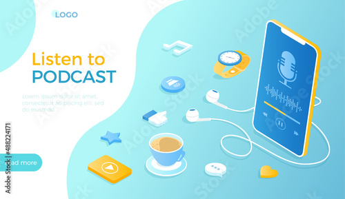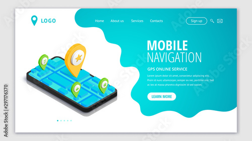 Applications for shopping banner, web template. Vector isometric smartphone with sale, discount, free gift signboards, magnifying glass on screen, copy space, read more button.