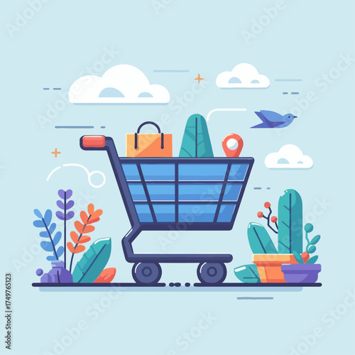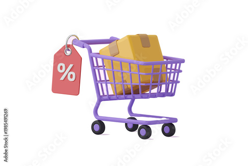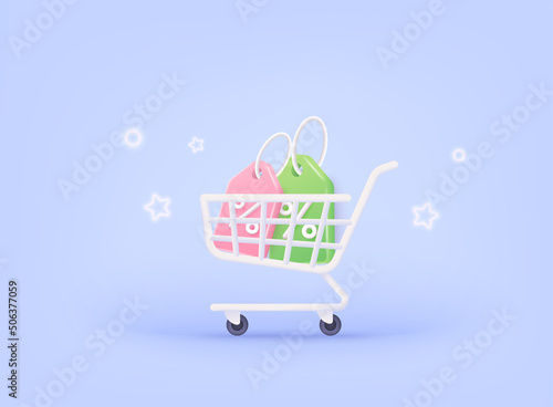 Shopping cart with gift boxes and paper bags, 3d vector illustration. Shopping sale promotion.