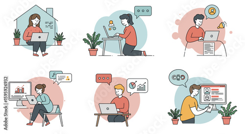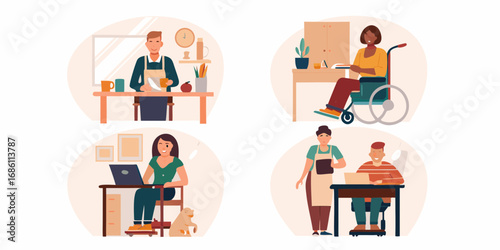 Shopping male, female cartoon character set, flat vector illustration. Happy people enjoying purchases, unpacking bags at home. Supermarket, mall, women clothing store, fashion boutique, grocery shop.