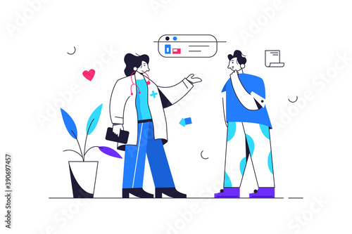 Shoulder arthritis. Patient suffering from joint pain, flat vector illustration. Tiny doctor characters holding syringe with injection, looking at xray pictures in clinic. Osteoarthritis joint disease