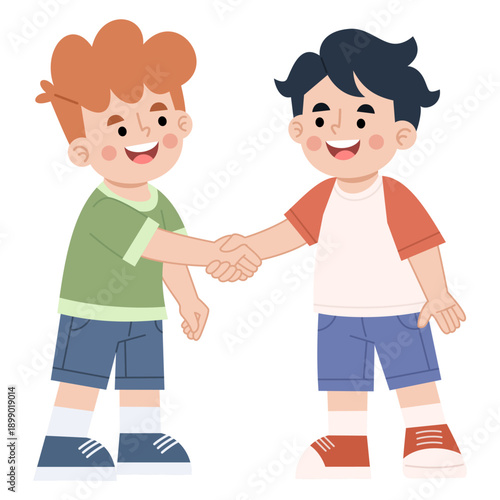 Shy little boy giving flower to girl vector illustration. Cute funny children isolated on white background. Male kid character presenting beautiful blossoms greeting friend with birthday party event