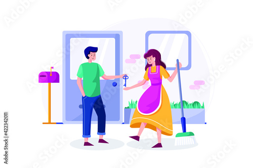Micro male and female characters dancing and listening to song of girl singing with microphone, vector illustration. Restaurant singer, live music concert.