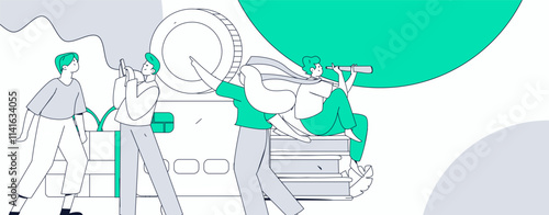 Happy people roller skating, riding skateboard, kick scooter, vector flat illustration. Active teens having fun in city park. Summer outdoor activities. Skate park for skaters sport and recreation.