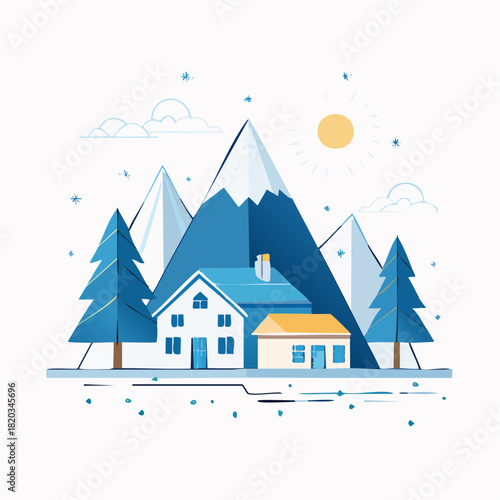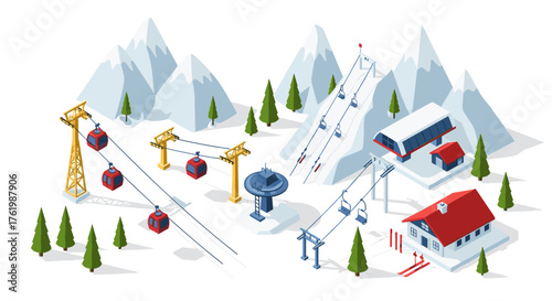 Vector illustration of ski lifts, chairlift and rope tow, bringing skiers up the slope. Downhill skiing, ski resort. Ski lift service flat style design elements.